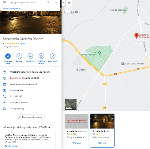 Jest tam jeszcze jedna mylna trochę informacja, bo nasza firma świadczy usługi na odległość, na radomskich cmentarzach, zawsze poza siedzibą firmy, adres "pocztowy" na wizytówce tak naprawdę jest adresem do korespondencji na potrzeby google a nie fizyczną lokalizacją.
